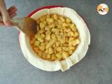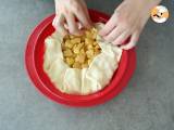 Den Blätterteig in eine Springform legen und mit einer Gabel kleine Löcher in den Boden stechen. Die Apfelmischung dazugeben und gut verrühren.