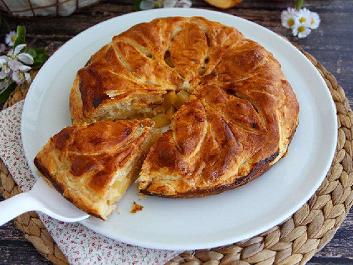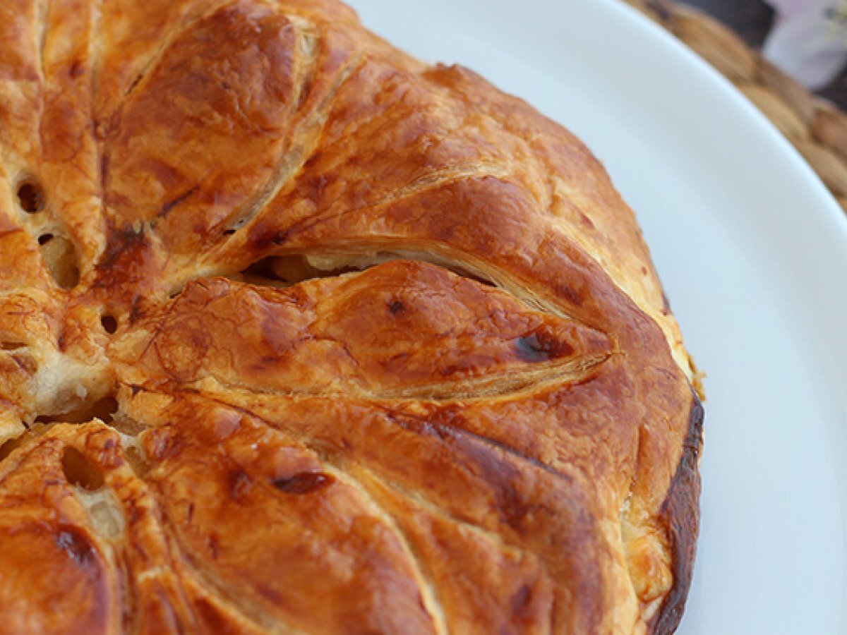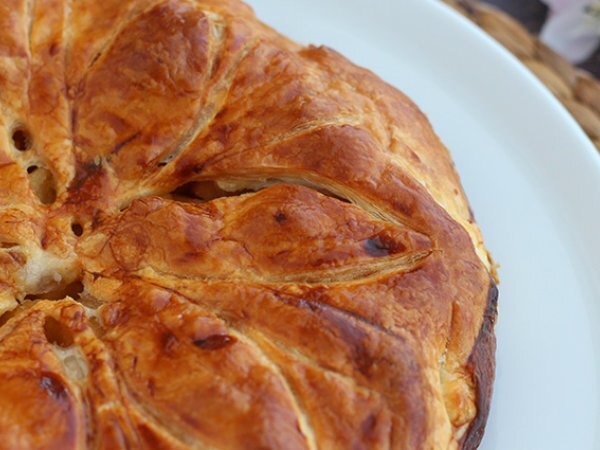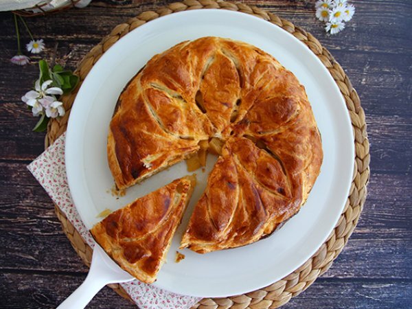 Das Eigelb mit der Milch verrühren und die Oberseite und Ränder des Kuchens damit bestreichen. Zeichnen Sie mit einem Messer das Muster Ihrer Wahl auf die Oberseite.