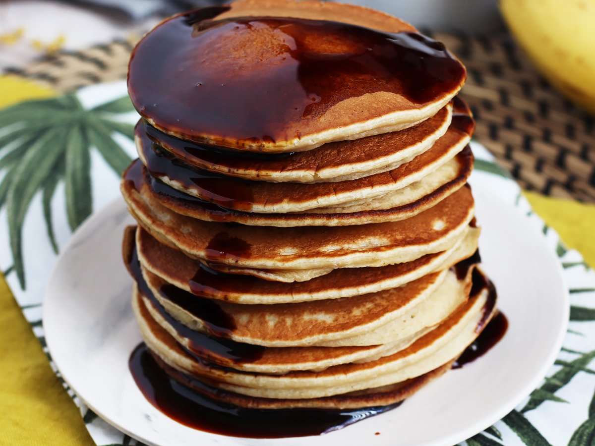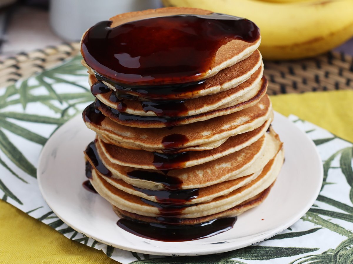 Zu Bananenpfannkuchen passen hervorragend frische Früchte, Nüsse, Joghurt, Schokoladensauce oder verschiedene Sirups wie Ahorn- oder Agavensirup.