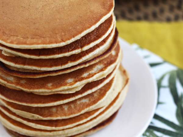 Es ist fertig! Stapeln Sie Ihre Pfannkuchen und gießen Sie Ahorn-, Agaven- oder Fruchtsirup darüber!