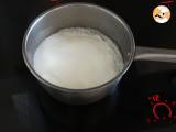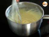 Die Milch mit dem restlichen Zucker und der Vanille in einem Topf aufkochen. Wenn es kocht, gießen Sie die Hälfte der Milch in die Mischung aus Ei, Zucker und Speisestärke. Gut vermischen und alles wieder in den Topf geben.
