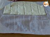 Wenn Ihr Teig rund ist, schneiden Sie die kleineren Enden ab und bewahren Sie sie zum Backen auf. Schneiden Sie gleich breite Rechtecke in den Teig. Machen Sie dasselbe mit dem zweiten Teig.