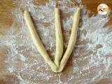 Nehmen Sie einen Teigling aus dem Kühlschrank und teilen Sie ihn in drei gleich schwere Stücke (ca. 160 g). Die Teigstücke zu Strängen rollen und auf eine bemehlte Arbeitsfläche legen.