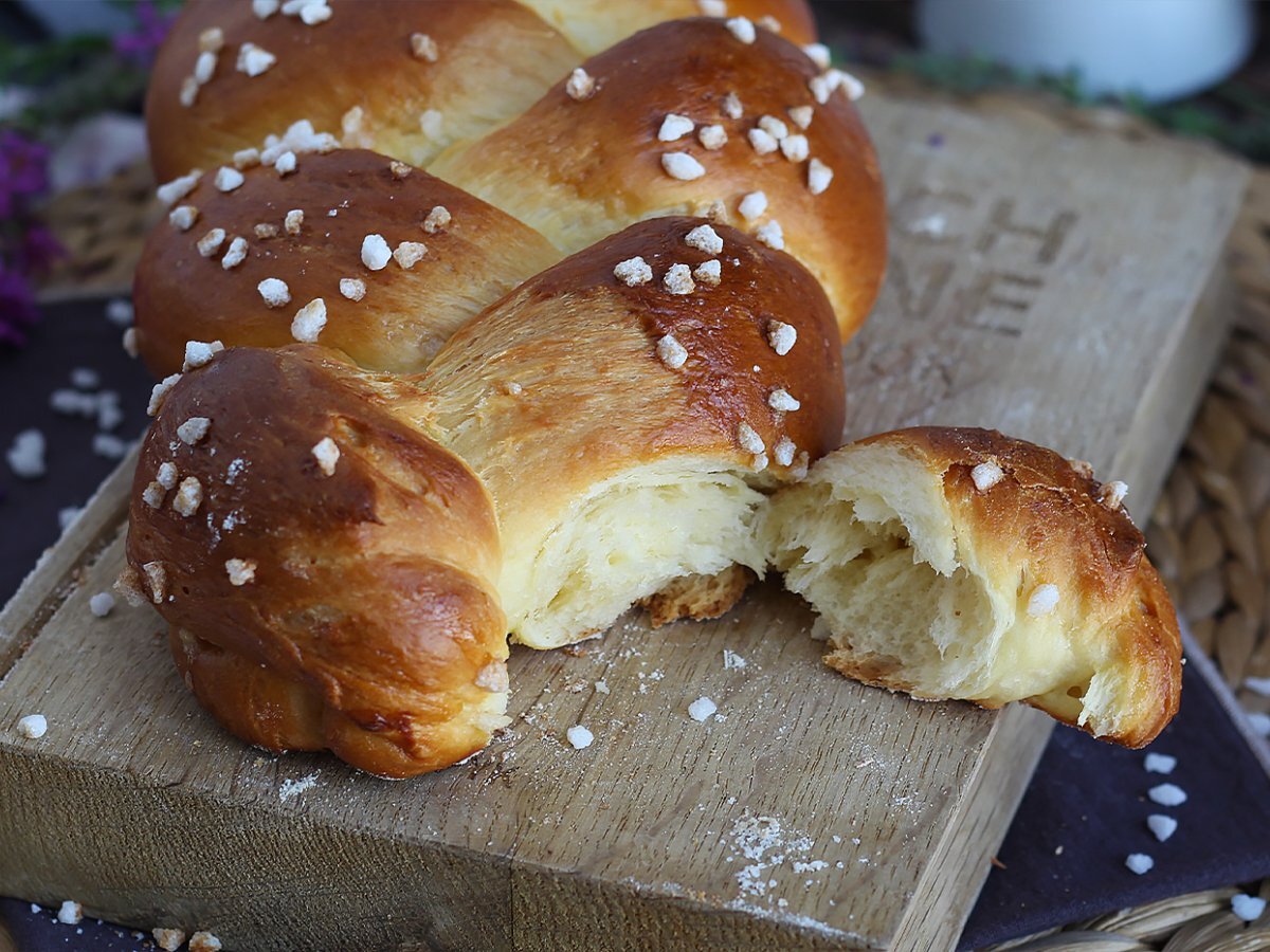 Mit Perlzucker bestreuen und dann im vorgeheizten Ofen bei 170 °C etwa 30 Minuten lang backen. Einen Behälter mit Wasser in den Ofen stellen, damit die Brioche nicht austrocknet.