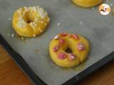 Bestreichen Sie die Brioche mit verquirltem Eigelb und bestreuen Sie sie dann mit Perlzucker und rosa Pralinen. Im vorgeheizten Ofen bei 180 °C 13 Minuten lang backen.