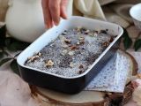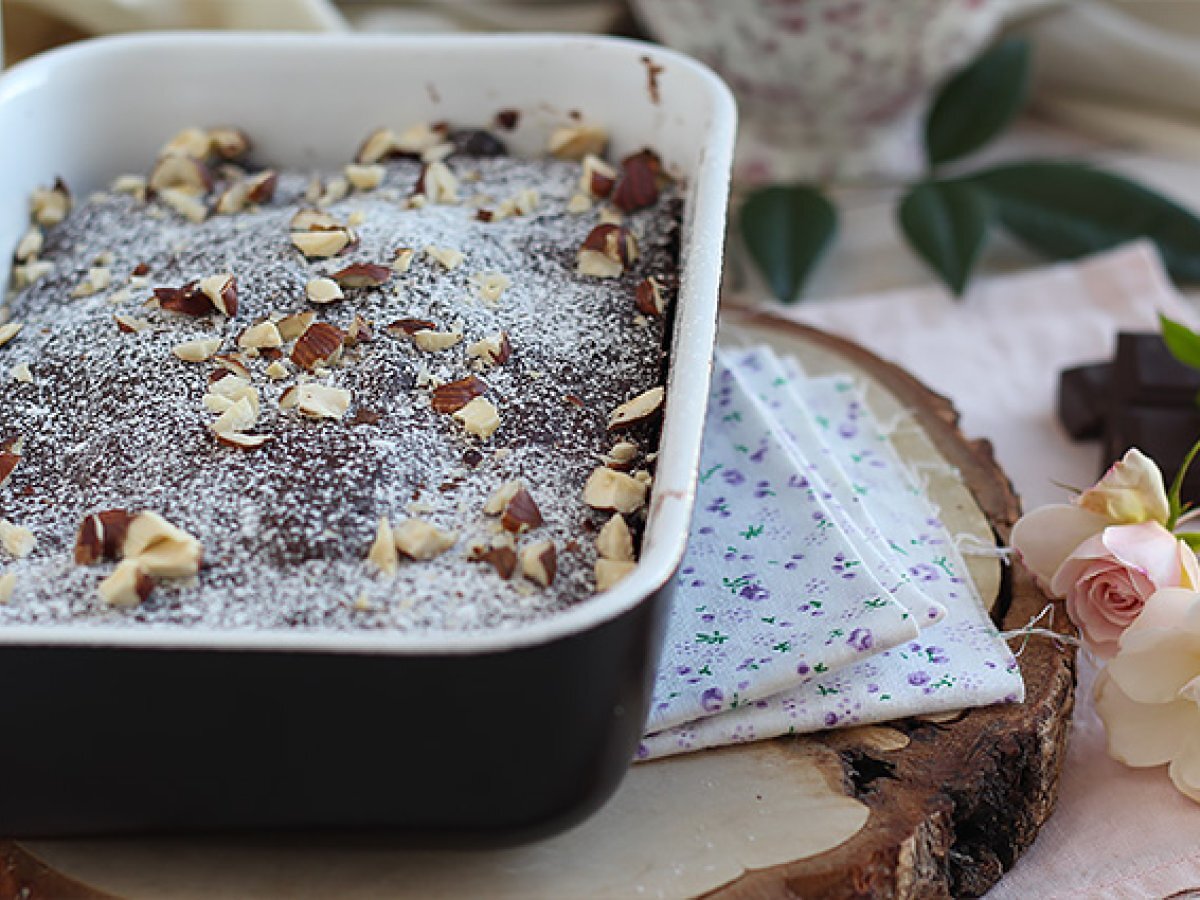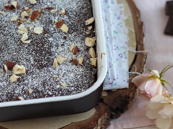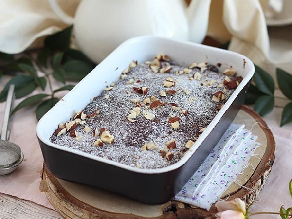Aus der Mikrowelle nehmen und abkühlen lassen. Mit Puderzucker und zerstoßenen Haselnüssen bestreuen. Es ist fertig !