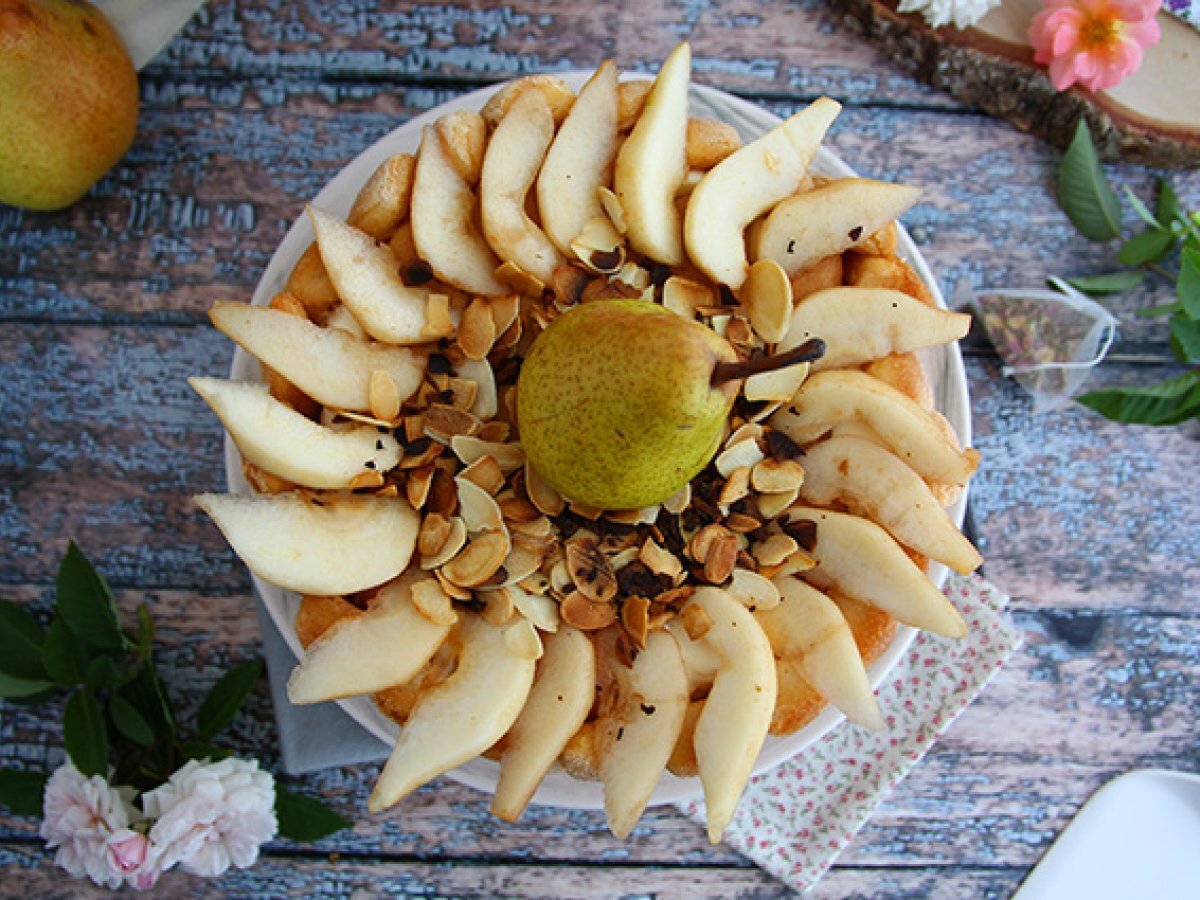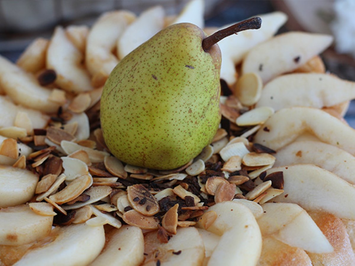 Die Dekoration: Die Birnenstücke nebeneinander an den Rand der Charlotte legen. In die Mitte geröstete Mandelblättchen geben und eine kleine ganze Birne in die Mitte setzen.