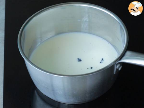 Die Milch mit der gespaltenen Vanilleschote zum Kochen bringen. In der Zwischenzeit das Eigelb in eine Schüssel geben und den Zucker hinzufügen. Kräftig verquirlen, bis die Mischung weiß wird.