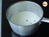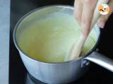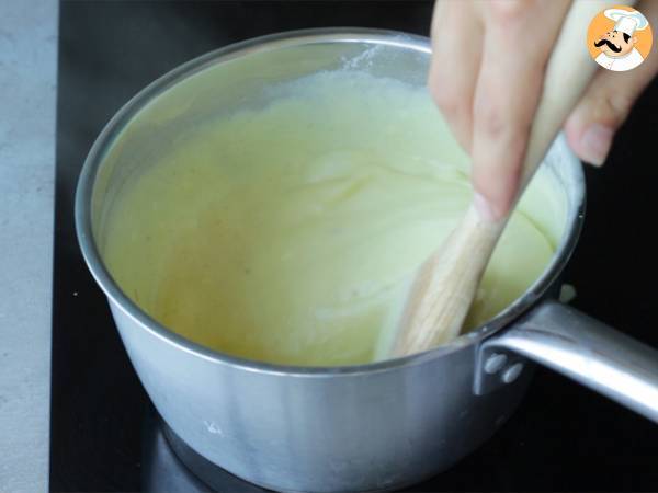 Die Maisstärke hinzufügen und gut vermischen. Sobald die Milch kocht, geben Sie sie nach und nach zur Ei-Zucker-Speisemehl-Mischung. Dann alles wieder in die Pfanne geben und auf das Feuer stellen (bei mittlerer Hitze).