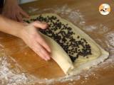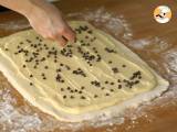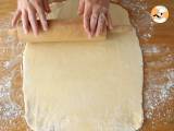 Den Brioche-Teig aus dem Kühlschrank nehmen und auf einer bemehlten Arbeitsfläche ausrollen. Bilden Sie ein Rechteck von etwa 30 x 40 cm.