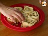 Rollen Sie den Brioche-Teig auf sich selbst und schneiden Sie dann etwa 4 cm lange Stücke ab.