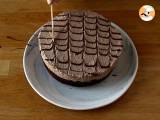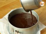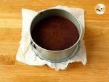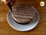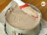 Legen Sie ein Rhodoid um den Biskuitkuchen und bedecken Sie ihn mit Schokoladenmousse. Die Oberseite gut glattstreichen und 30 Minuten kühl stellen.