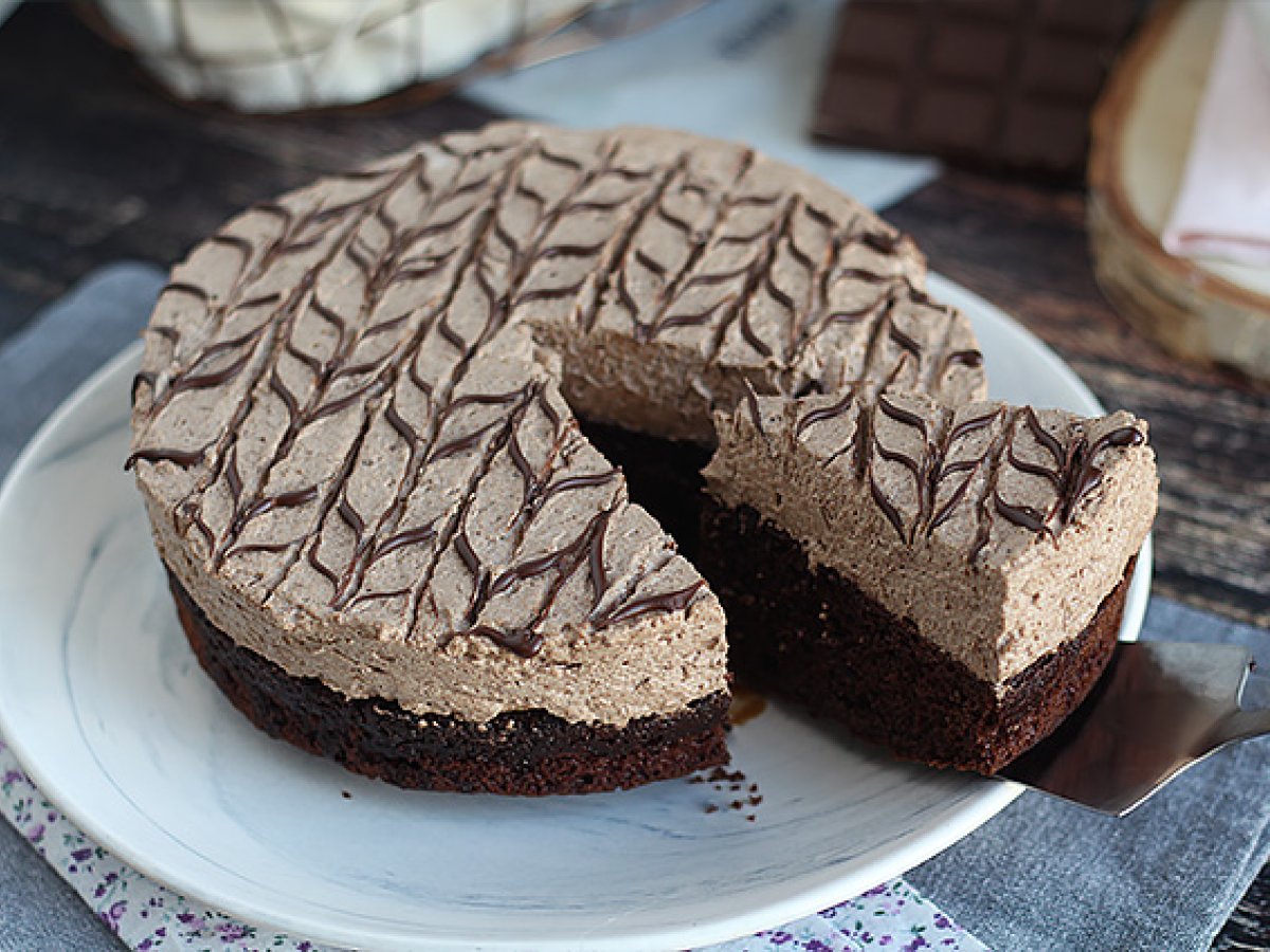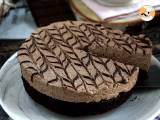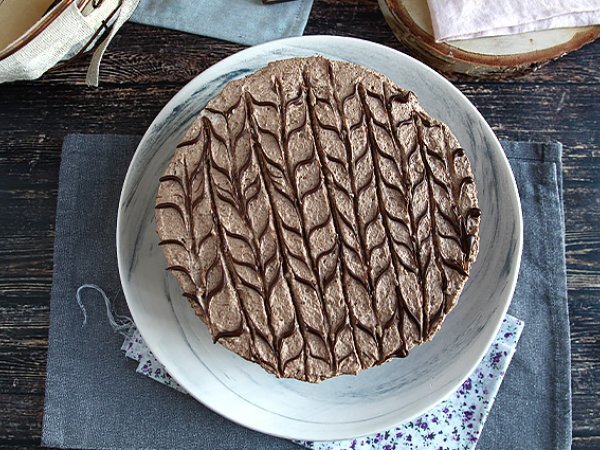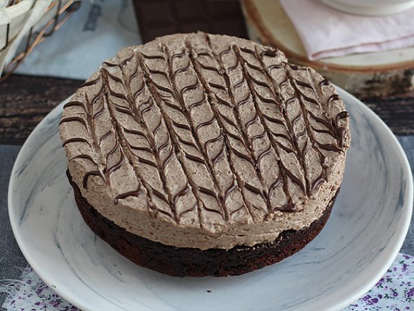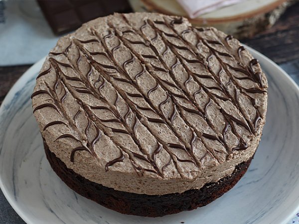 Sie können den Kuchen mit geschmolzener dunkler Schokolade dekorieren, indem Sie Linien auf die Schokoladenmousse zeichnen.