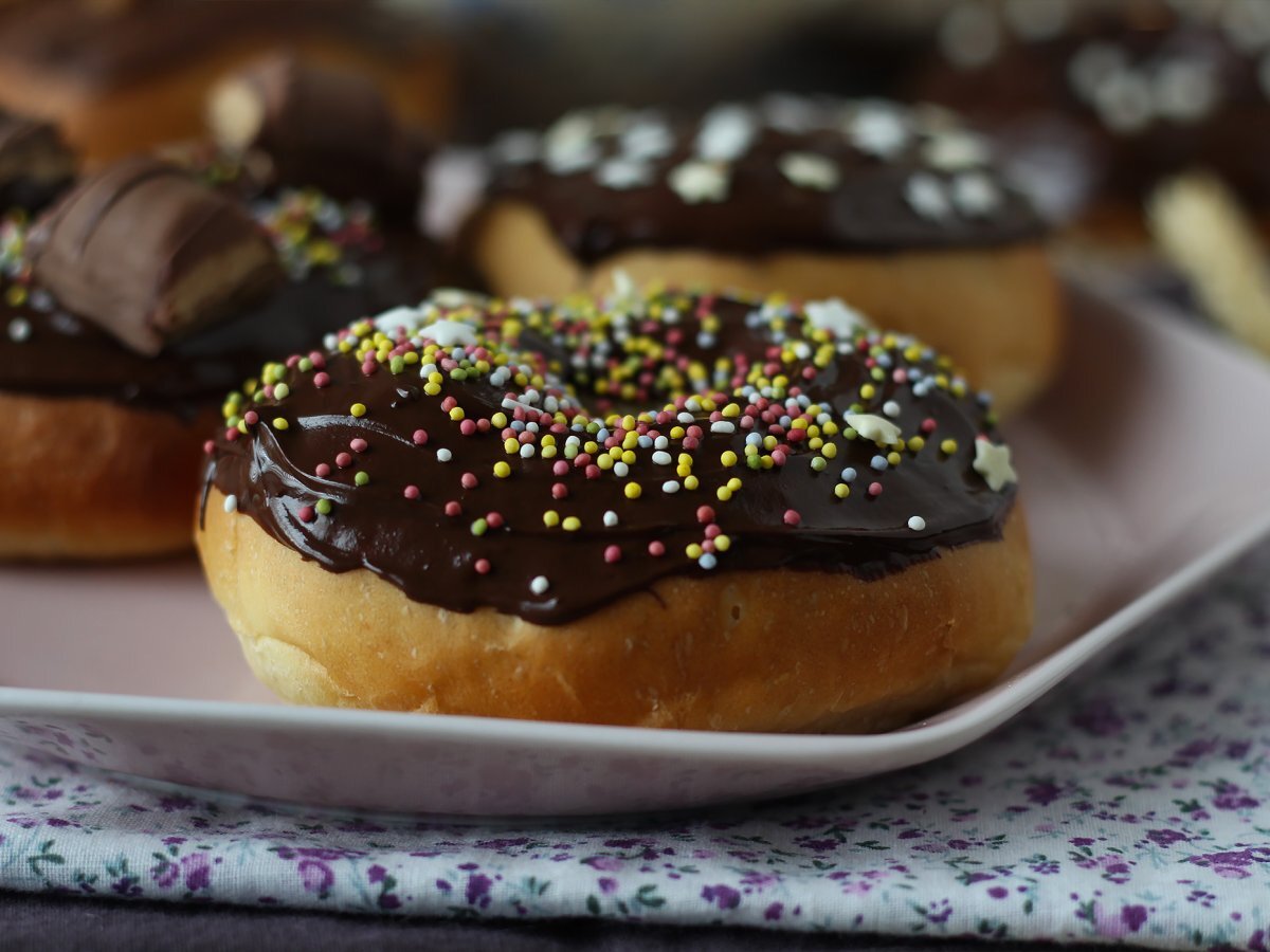 Schmelzen Sie die Schokolade und tauchen Sie die Donuts darin ein. Bestreuen Sie die Oberseite mit den Toppings Ihrer Wahl und schon ist es fertig!