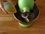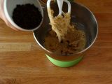 Geben Sie die weiche Butter, den weißen Zucker und den braunen Zucker in die Schüssel der Küchenmaschine. Bei langsamer Geschwindigkeit mit dem Blatt vermischen. Das ganze Ei hinzufügen und erneut verrühren.