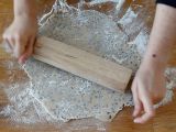 Die Arbeitsfläche gut bemehlen und den Keksteig ausrollen, dabei regelmäßig bemehlen. Es sollte etwa 5 mm dick sein.