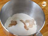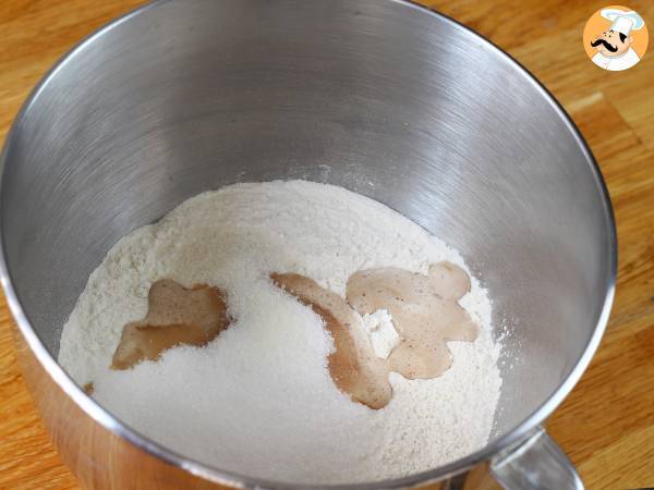 Mehl, Zucker, Vanillezucker und Salz in einer großen Schüssel geben, Hefe darüber streuen und mit der Milch-Butter Mischung verrühren.
