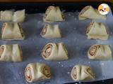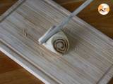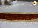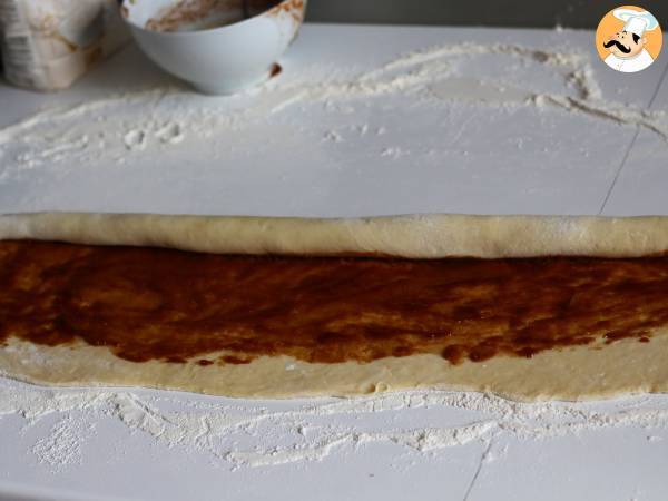 Den Teig auf einer leicht bemehlten Arbeitsfläche erneut durchkneten und auf circa 60x30cm Fläche ausbreiten. Dann die Füllung darauf verstreichen und von der Langen Seite her aufrollen.