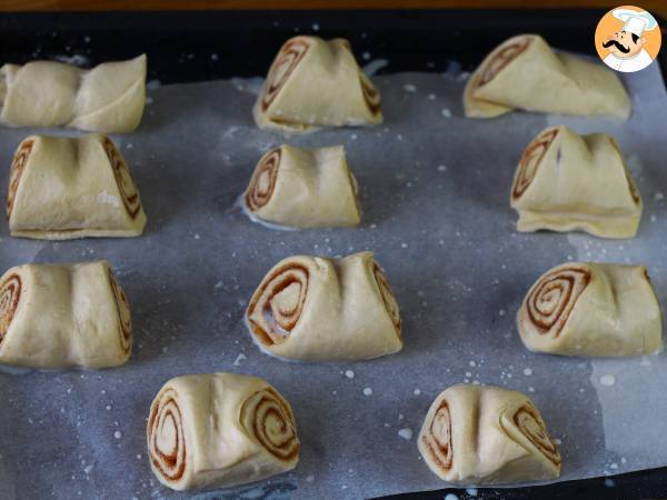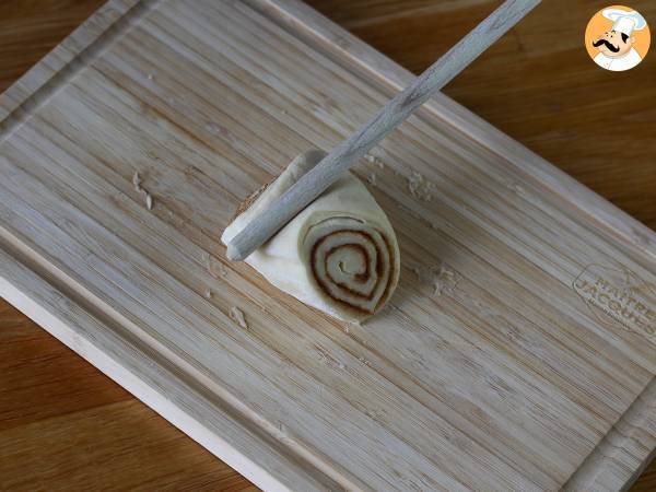 Dann mit dem Stiel eines Kochlöffels die kleine Seite zwischen den Zimtwirbeln so eindrücken, dass der Zimt nach oben schaut.