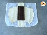 Den Blätterteig ausrollen. Legen Sie die Tafel Schokolade in die Mitte. Schneiden Sie Streifen auf jeder Seite des Regals entsprechend dem Umriss der Quadrate ab.