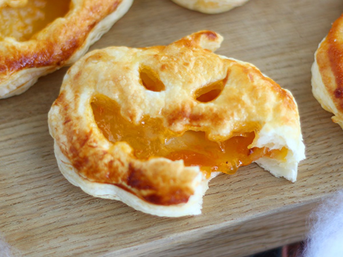 Schneiden Sie erneut einen Kürbis aus dem Blätterteig, diesmal auch die Augen und den Mund. Legen Sie den geschnittenen Kürbis auf die Aprikosenkonfitüre, um den Blätterteig zu schließen.