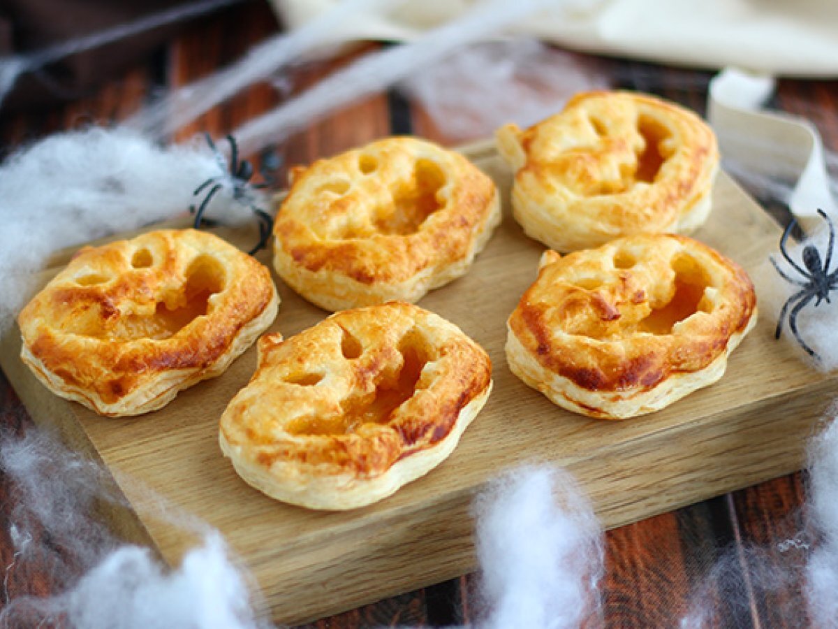 Wiederholen Sie den Vorgang, um 5 Halloween-Blätterteigtaschen zu machen. Legen Sie sie für 20 Minuten bei 180 °C in den Ofen.