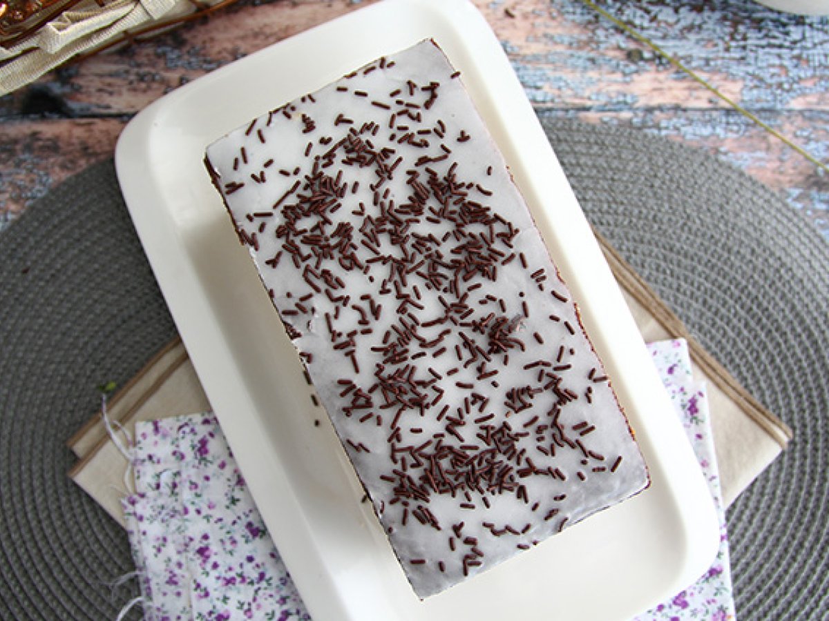Die Oberseite des Kuchens mit der Glasur bestreichen. Mit den Schokoladenstreuseln bestreuen und 1 Stunde kühl stellen.