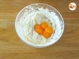 Trennen Sie das Eiweiß vom Eigelb. Das Eigelb sowie die Milch zur Mischung geben und gut verrühren.