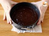 Senken Sie die Ofentemperatur mit Umluft auf 150 °C. Den Teig über den Brownie in die Pfanne gießen.