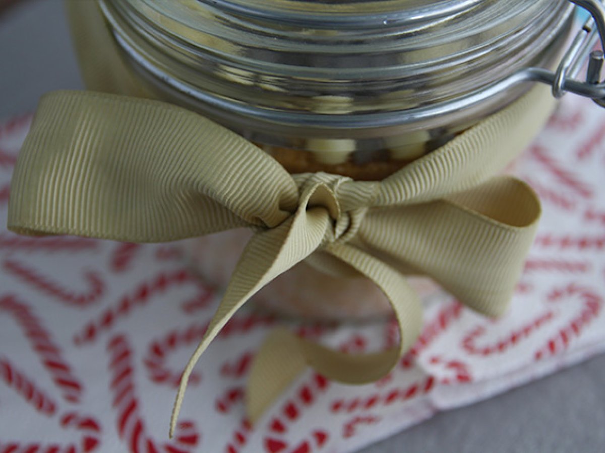 Das geschlossene Glas mit dem Band umwickeln und zu einer großen Schleife binden. Das Glas verschenken :-)