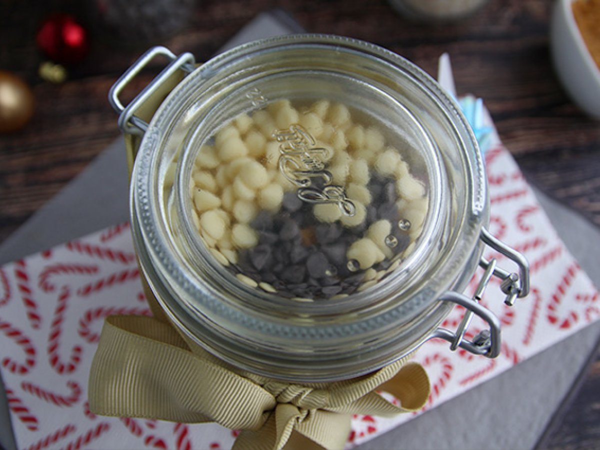 Das Glas öffnen und den Rundkornreis einfüllen. Braunen Zucker hinzufügen und den Rest des Glases mit dunklen und weißen Schokoladenstückchen füllen. Das Glas wieder verschließen.