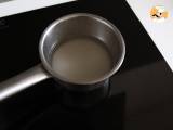 In der Zwischenzeit Wasser und Zucker in einen Topf geben und vermischen. Bei mittlerer Hitze erhitzen und den Zucker auflösen und den Sirup eindicken lassen.