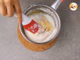 Nehmen Sie die Pfanne vom Herd und geben Sie dann 100 g Kokosraspeln hinzu. Geben Sie die Mischung in eine Schüssel und lassen Sie sie abkühlen.