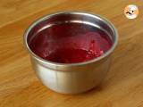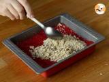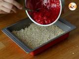 Die Hälfte der Mischung in eine gefettete Pfanne geben. Mit einem flachen Glas gut verpacken. Die Himbeermischung darüber gießen.