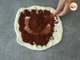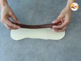 Die hellbraune Teigschlange hineinlegen und grob verschließen. Nehmen Sie ein Stück vom hellen Teig und formen Sie einen 20 cm langen Strang. Diesen flach drücken und dann den dunkelbraunen/hellbraunen Strang hineinlegen und verschließen.