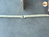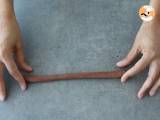 Die Kugeln aus den Schachteln nehmen und dann jede Kugel in 7 Stücke teilen. Nehmen Sie eines der Stücke vom hellbraunen Teig und formen Sie es zu einer 20 cm langen Rolle. Das Gleiche mit dem dunkelbraunen Teig machen und diesen dann flach drücken.