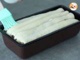Die so entstandene Teigschlange aufrollen, bis sie etwa 40 Zentimeter lang ist, und in der Mitte durchschneiden. Alle Stränge nach dem Zufallsprinzip in die gebutterte Cakeform legen.