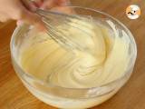 Schlagen Sie die Eier mit dem Zucker schaumig. Joghurt zugeben und verrühren. Mehl und Backpulver unterrühren. Die geschmolzene Butter unterrühren.