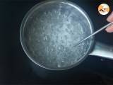 Wasser und Zucker in einen Topf geben und zum Kochen bringen. Stellen Sie ein Thermometer hinein, die Temperatur sollte 130°C erreichen (oder lassen Sie es ca. 5 Minuten kochen).