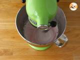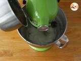 Wenn der Sirup seine Temperatur erreicht hat, träufeln Sie ihn über das Eiweiß, während Sie bei niedriger Geschwindigkeit weiterschlagen. Nach dem Eingießen des Sirups die abgetropfte Gelatine hinzufügen.