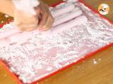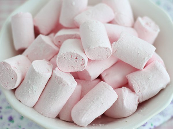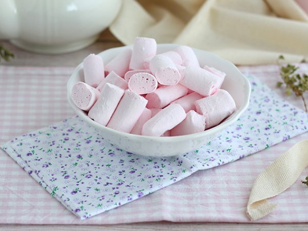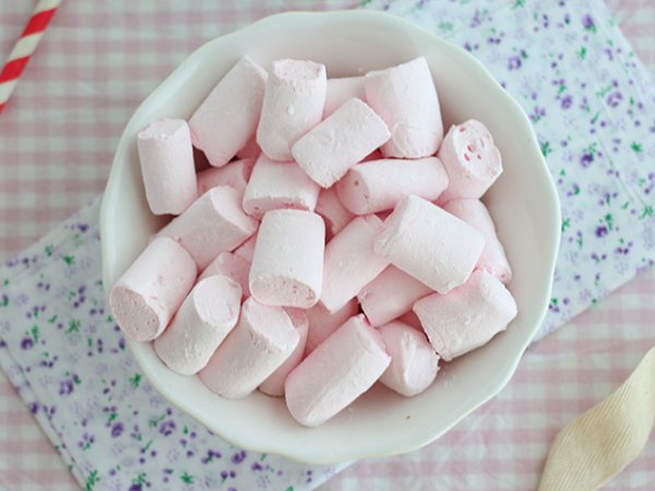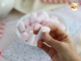 Mit einem Spritzbeutel große Marshmallow-Würstchen formen. Wenn Sie keinen haben, gießen Sie den Marshmallow direkt in eine Schüssel, die mit der Mischung aus Maisstärke und Puderzucker bedeckt ist. Anschließend den Marshmallow mit der Maisstärke-Puderzucker-Mischung bestreuen und für 3 Stunden in den Kühlschrank stellen.