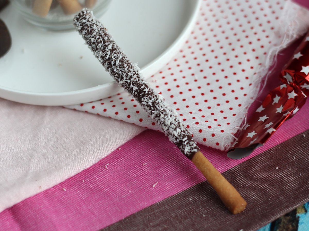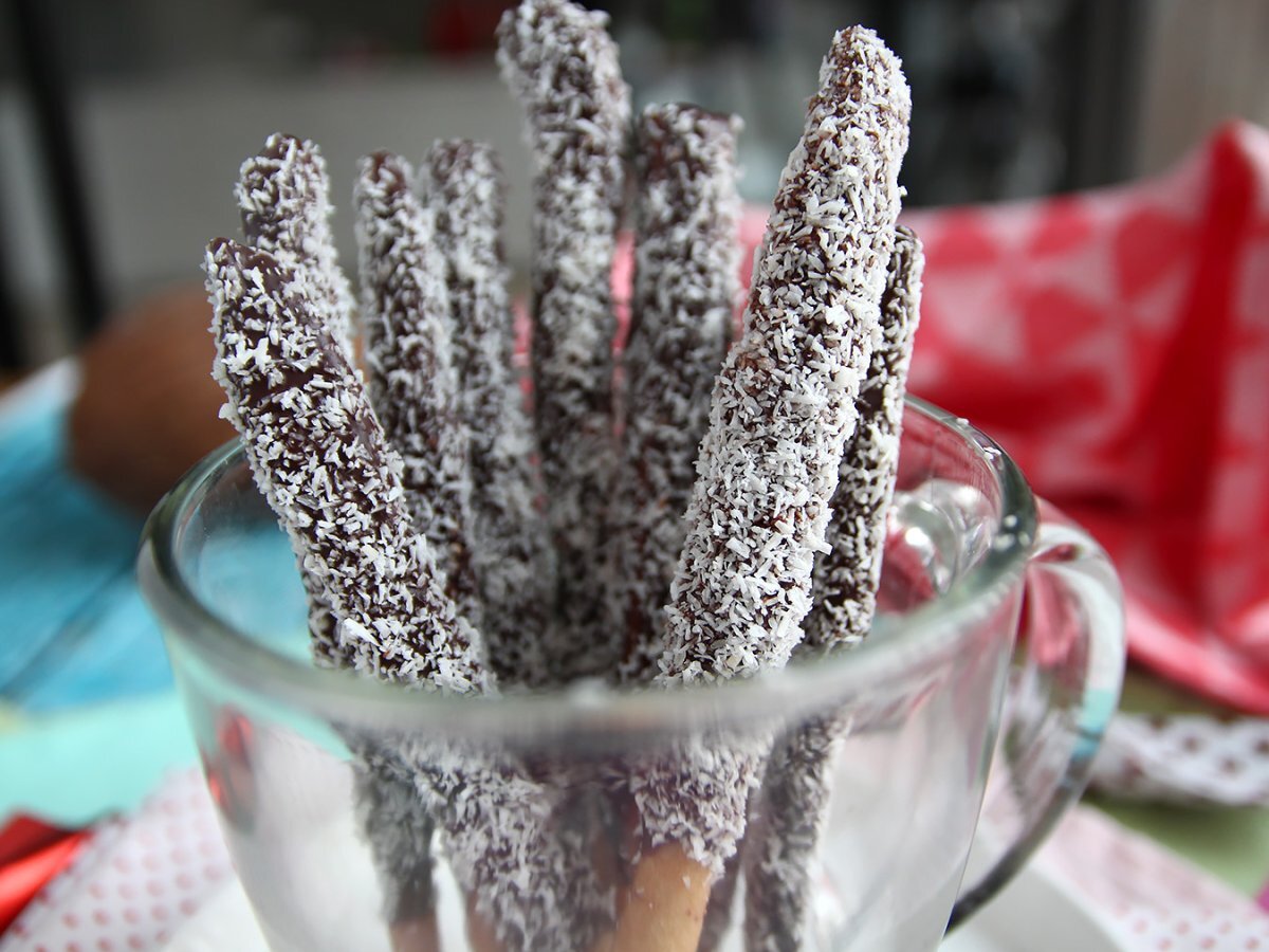 10 Minuten bei 180 °C backen. Abkühlen lassen und dann die Stäbchen in geschmolzene Zartbitterschokolade tauchen. Mit Kokosraspeln bestreuen und 15 Minuten kühl stellen.