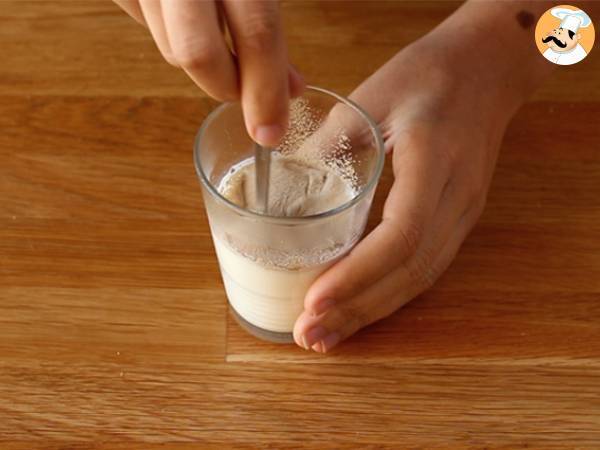 Vermischen Sie die lauwarme Milch mit der Hefe und lassen Sie sie 10 Minuten ruhen.
