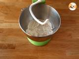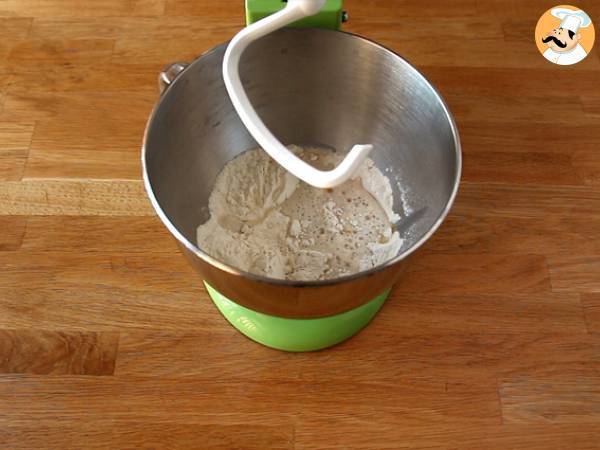 Geben Sie Zucker, Mehl und Ei in die Knetschüssel und fügen Sie die Mischung aus Milch + Hefe hinzu (die Hefe darf nicht mit dem Zucker in Berührung kommen). Etwa 4 Minuten lang kneten.