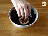 Die Mini-Waffeln herausnehmen und abkühlen lassen. Die Schokolade mit dem Kokosöl schmelzen und eine Seite der Waffel darin eintauchen. Gegebenenfalls einen Holzspieß zu Hilfe nehmen. Die Waffeln 30 Minuten kühl stellen.