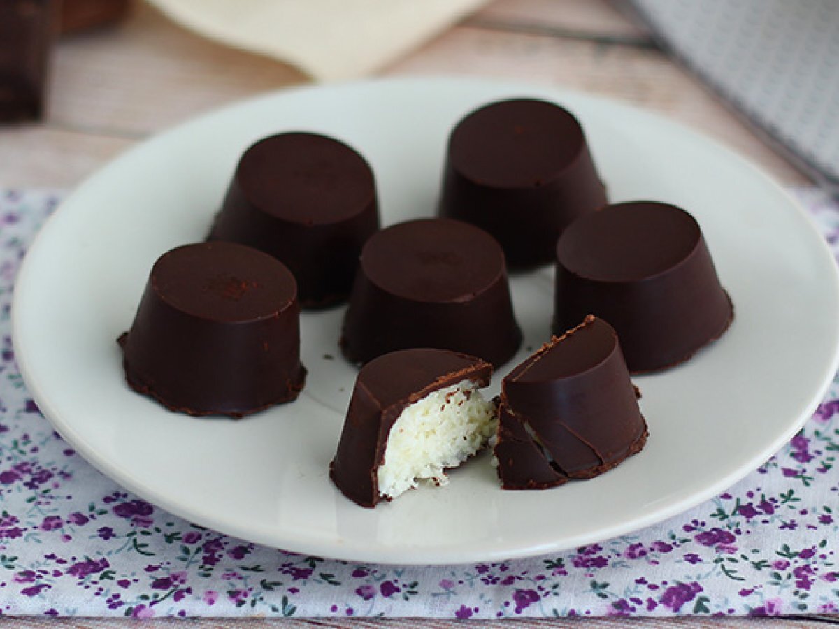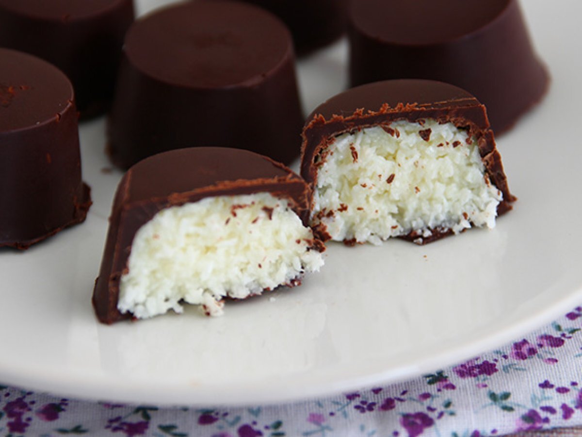 Die Kokosraspeln mit der gesüßten Kondensmilch zu einer Paste vermischen. Mit den Fingern Kugeln formen und die Vertiefungen mit Schokolade füllen.