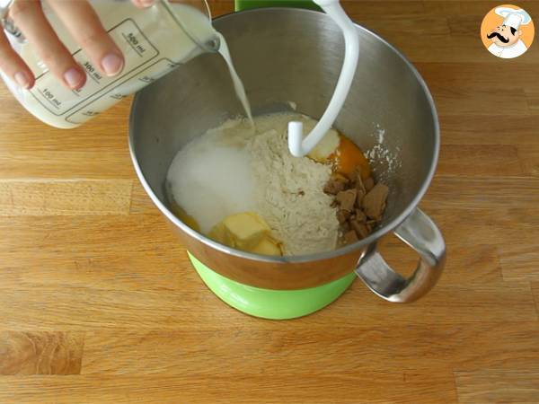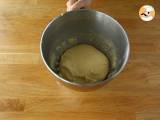 Kneten Sie den Teig für 3 bis 5 Minuten bei Geschwindigkeit 2. Eine Kugel bilden und mit einem Tuch abdecken. Lassen Sie die Paste 2 Stunden bei Raumtemperatur stehen.