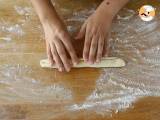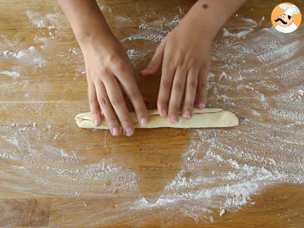 Den Teig in 8 gleiche Kugeln von je 120 gr schneiden. Die Kugeln im Mehl formen und verteilen. Reiben Sie die Oberfläche mit Streichpaste und rollen Sie sie dann von links nach rechts, um einen Knüppel zu bilden.