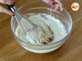 Die flüssigen Zutaten hinzufügen: den Saft einer halben Zitrone + die Sojasahne + den Vanilleextrakt und vermischen.