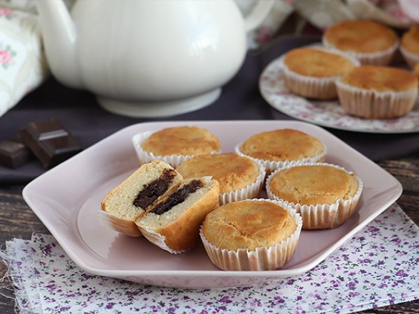 In jede Form ein Quadrat Schokolade drücken und mit Teig bedecken.